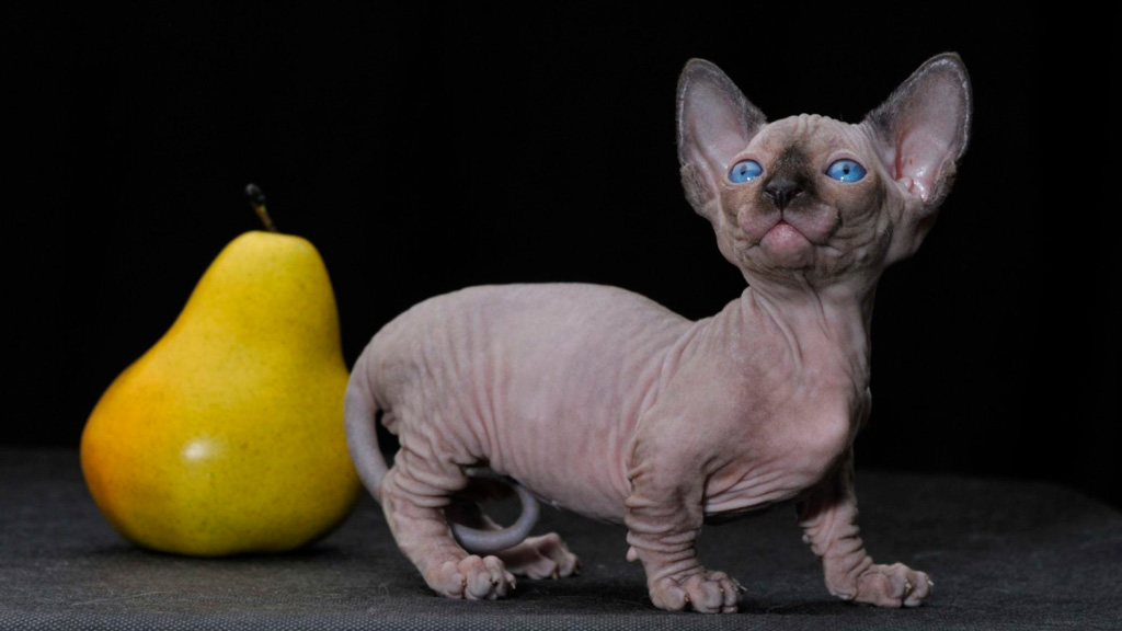 У таких маленьких представителей кошачьих достаточно толстая кожа с хорошим запасом подкожного жира. Имеются крупные складки, большая часть которых приходится на плечи, передние ноги, область между ушками, шею и мордочку. Шерсть у данной породы может совершенно отсутствовать либо быть в небольшом количестве. Как правило, немного светлых волосков можно увидеть на ножках, переносице, хвосте и внешней стороне ушей. Иногда можно встретить котят с велюровой шерстью по всему телу, но она не достигает 2 мм в длину. На ощупь кожа очень нежная и бархатная. Вибриссы у котов либо имеют извитую обломанную форму, либо вовсе отсутствуют.